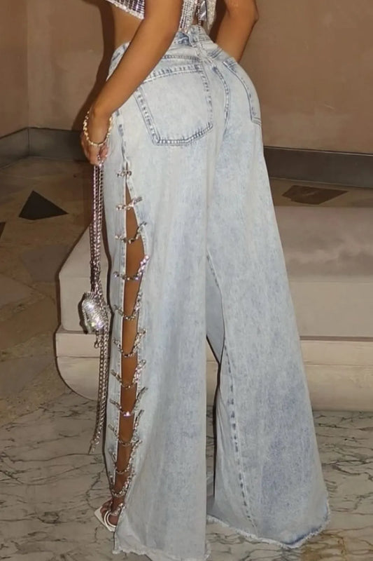 Sequin Fringe Trim Distressed Button Up Denim Jacket
